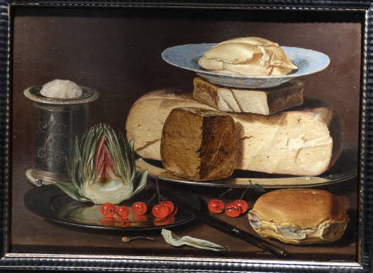 Natureza-morta com queijos, alcachofra e cerejas. Clara Peeters, 1625.